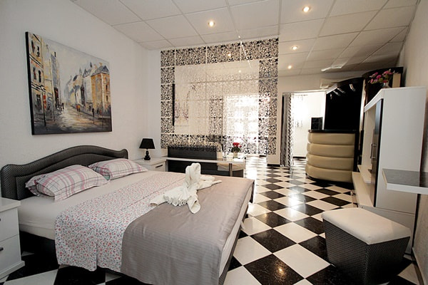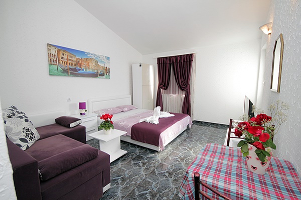Apartament typu studio składa się z sypialni z łóżkiem podwójnym dla 2 osób dorosłych, łóżka pojedynczego dla 1 osoby dorosłej, telewizora, sejfu, żelazka, deski do prasowania, aneksu kuchennego z przyborami kuchennymi, lodówką i płytą grzejną.